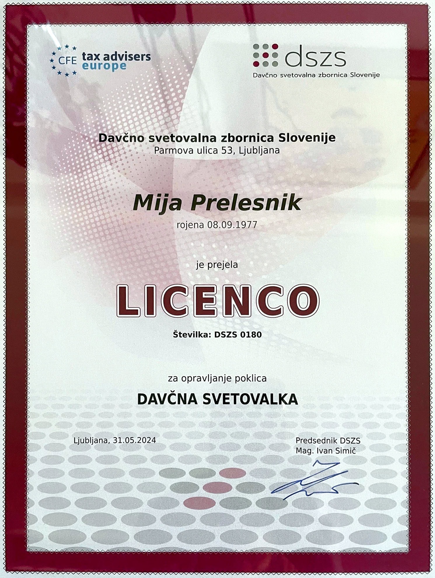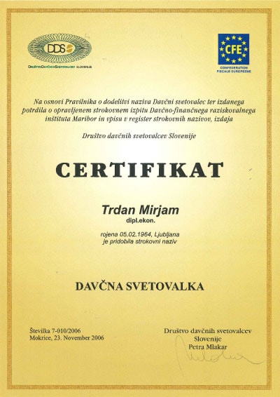 Svojo usposobljenost za davčno svetovanje dokazujemo tudi s pridobljenim certifikatom in članstvom v Davčno svetovalni zbornici.